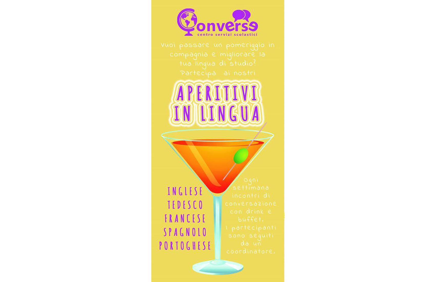 Aperitivo in lingua inglese, tedesca, spagnola o portoghese organizzato da CONVERSE Centro Servizi Scolastici a Udine.
